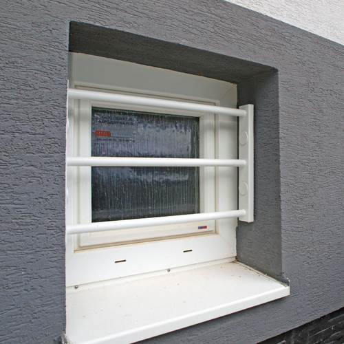 - Schutz gegen Durchsägen. Doppelte massive Stahlstangen. Jede massive Stahlstange ist doppelt ausgeführt, wobei die innere Stange drehbar ist, was ein Durchsägen unmöglich macht.