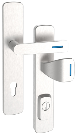 Rostex RX1 Astra RC3 Sicherheitsbeschlag, Edelstahl matt, Luminoblau, Bologna-Griff – Quadratischer Griff
