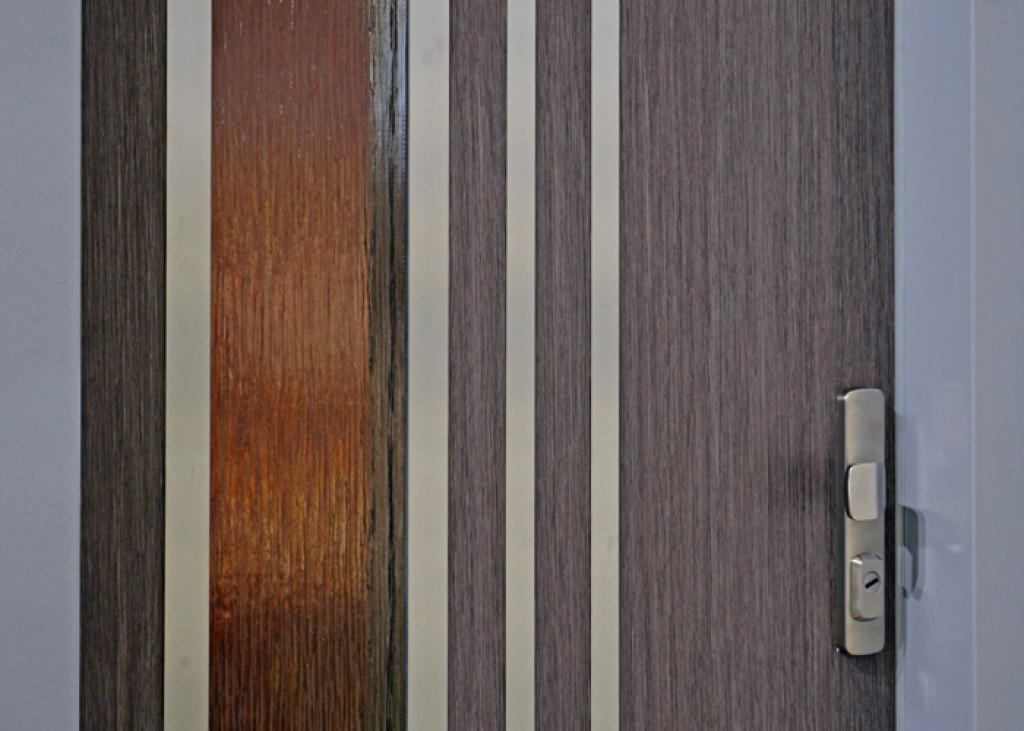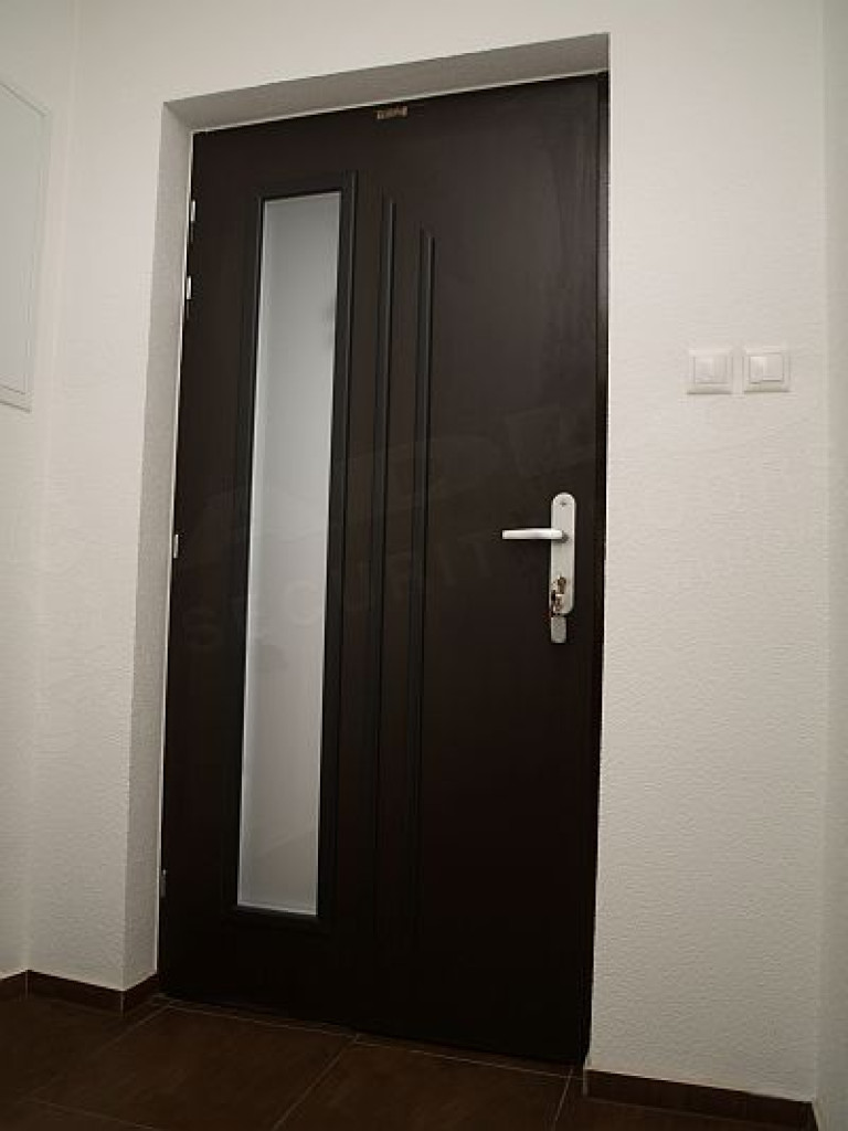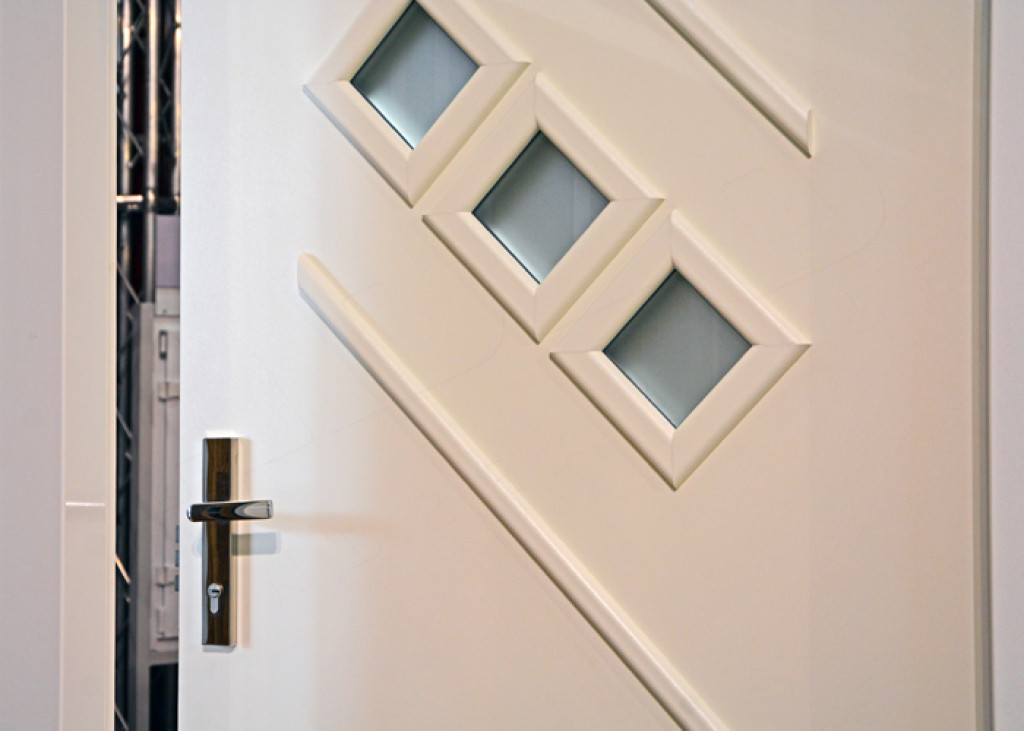 ADLO - Sicherheitstür TESIM, Oberfläche Sprela, atypische Glasausführung, AQUA