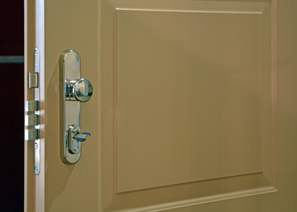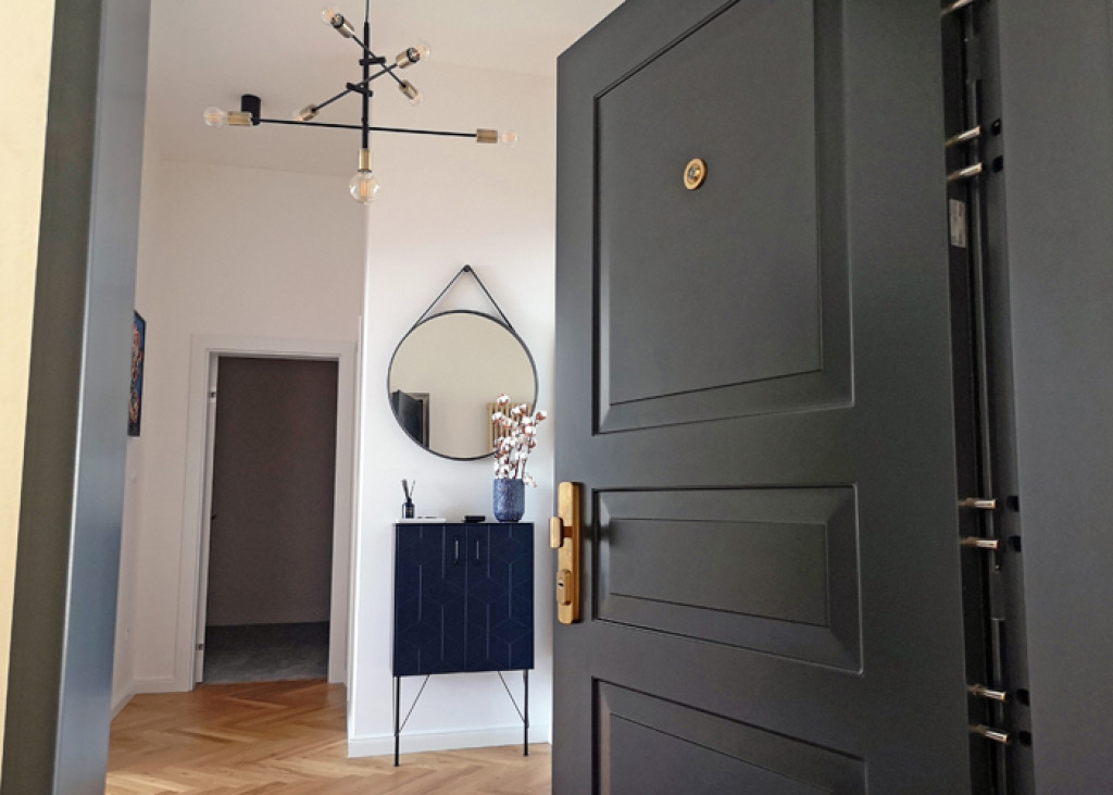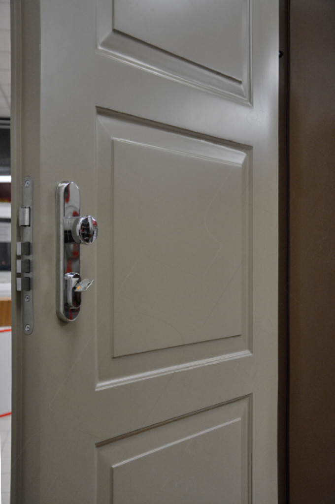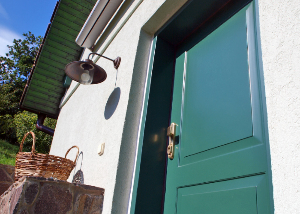 ADLO - Sicherheitstür ADUO, atypisches Kasettendesign, Oberfläche RAL 6019, atypische Verkleidung der Türzarge