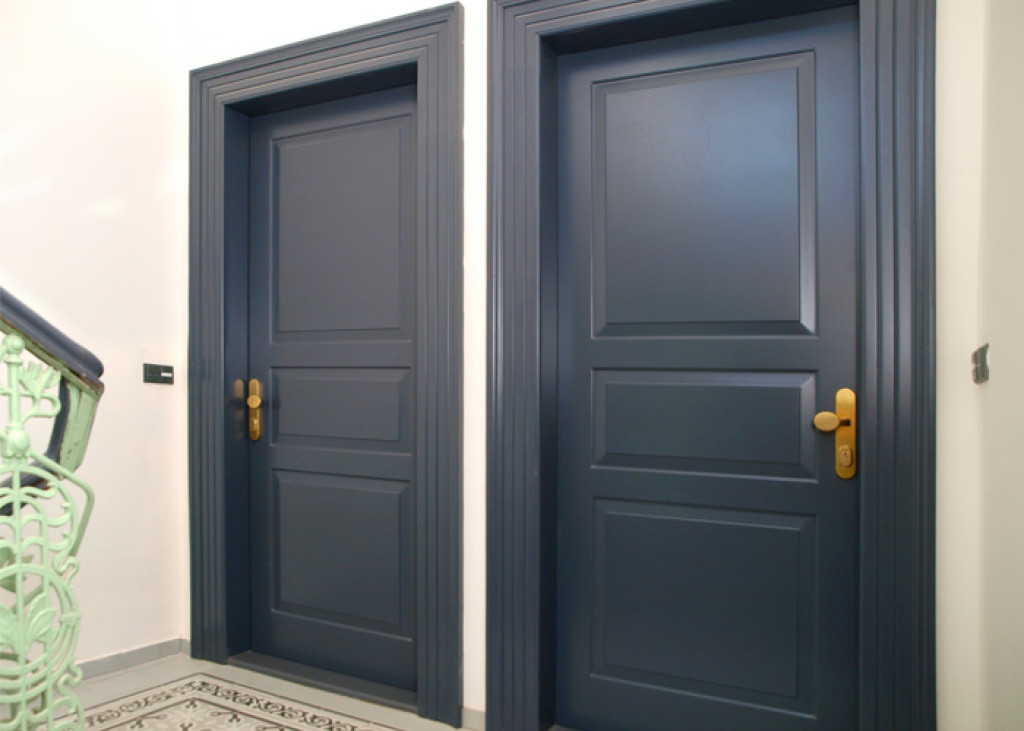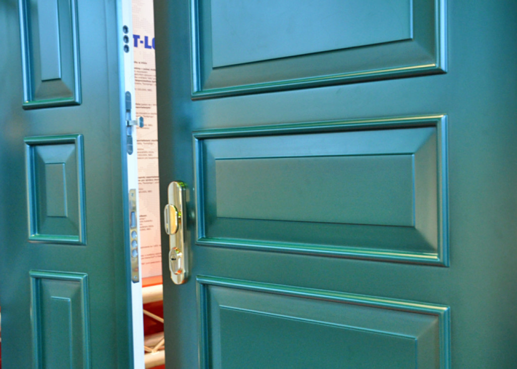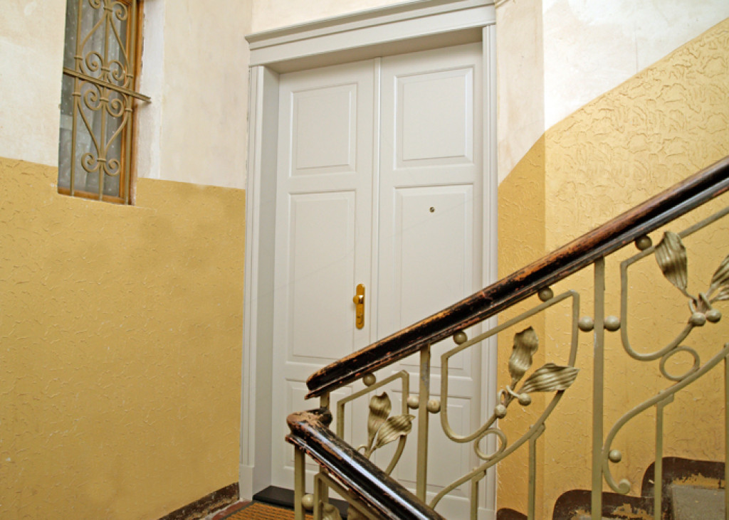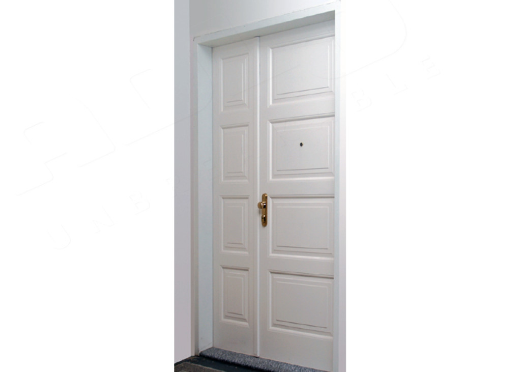 ADLO - Doppelflügel-Sicherheitstür ADUO, atypisches Kasettendesign, RAL 6019, atypische Verkleidung der Türzarge