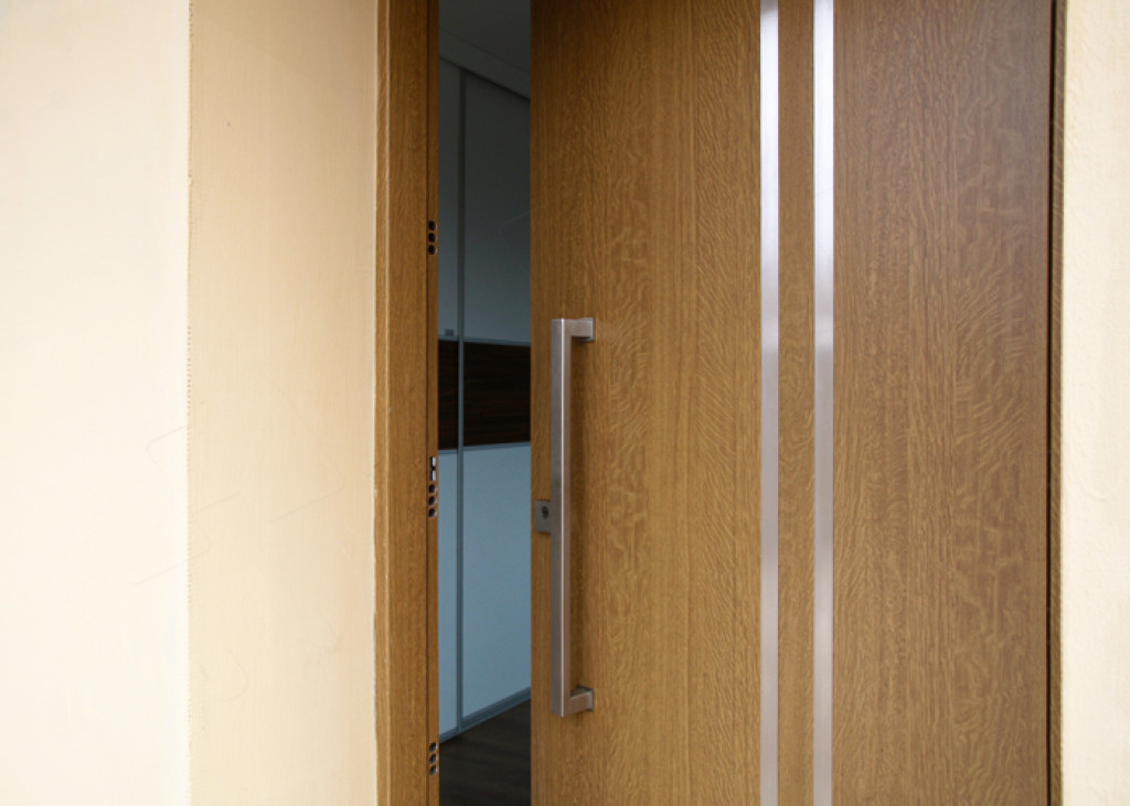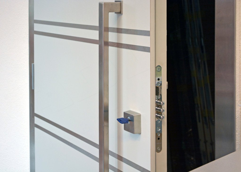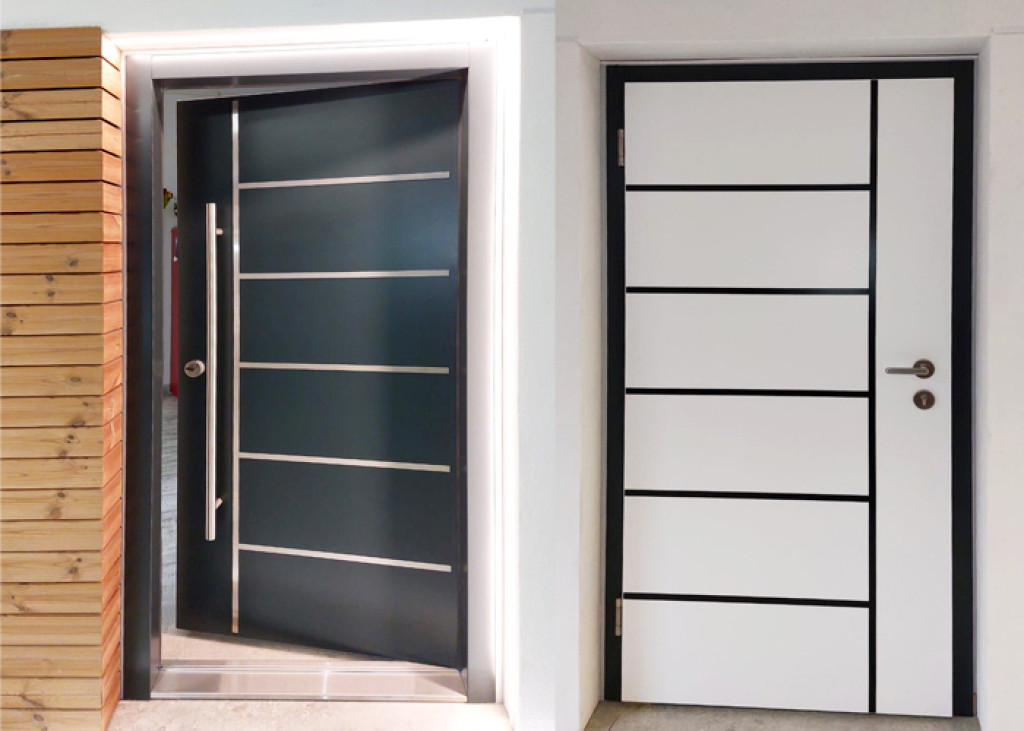 ADLO - Thermo-Sicherheitstür ADUO, Leistenausführung atypisches Design, Flachleisten aus Edelstahl, senkrechter Türgriff
