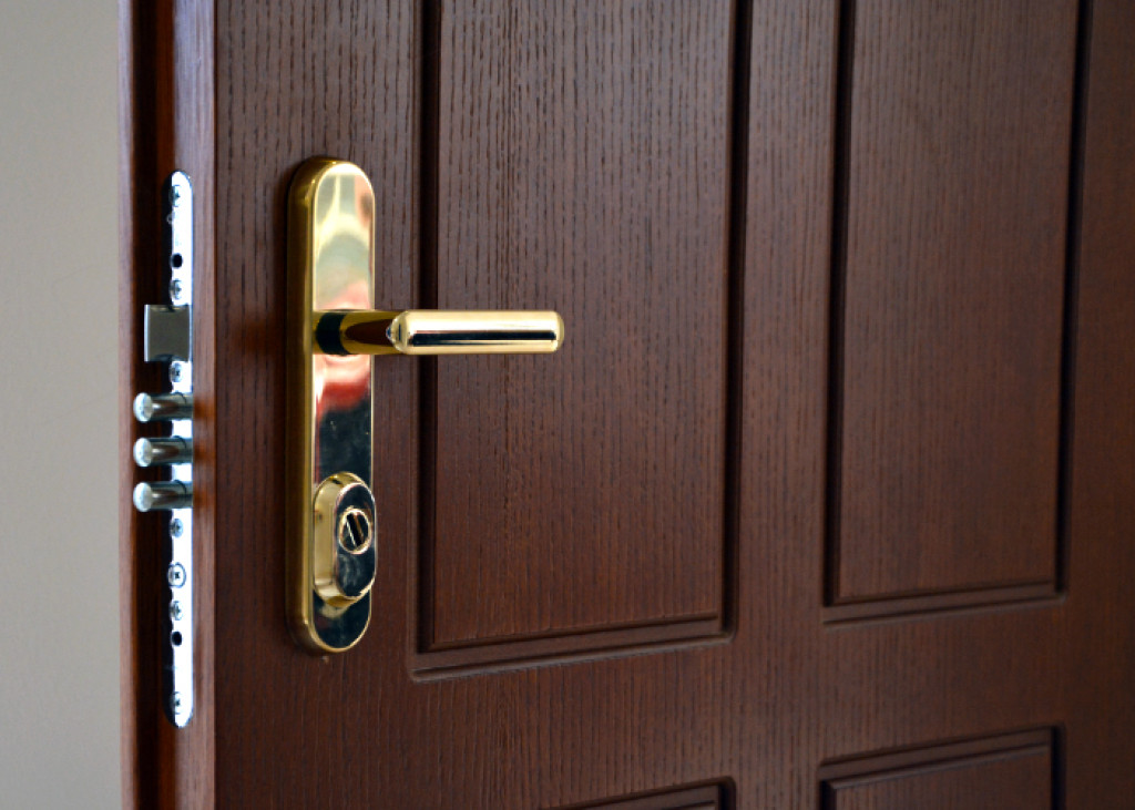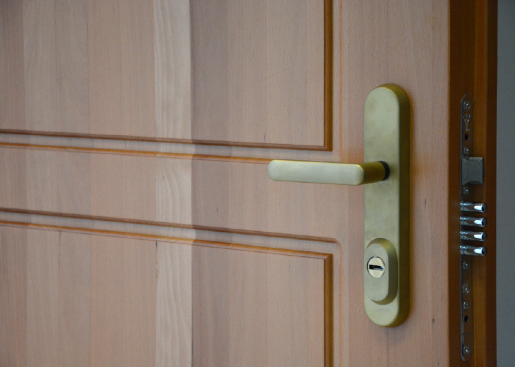ADLO - Sicherheitstür Aduo, Türendesign profiliert, Furnier EICHE, Farbabstimmung des Beschlags, des Hebels und des Türspions